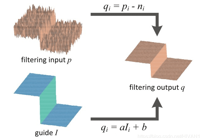 输入: 输入图像p,经过引导图像I, 滤波得到输出图像q